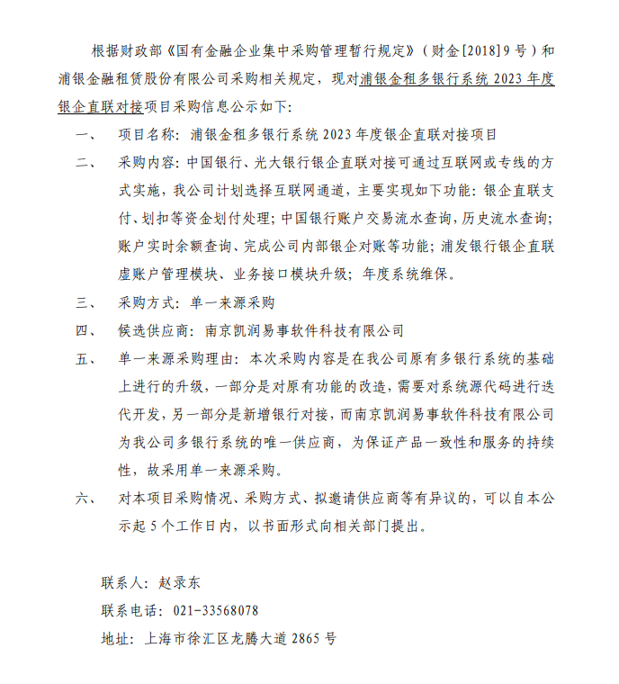 浦银金租多银行系统 2023 年度银企直联对接项目 单一来源采购信息公告