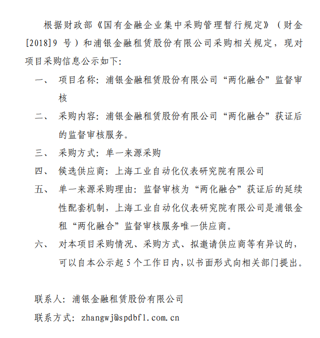 浦银金融租赁股份有限公司“两化融合”监督审核 服务项目单一来源采购信息公告