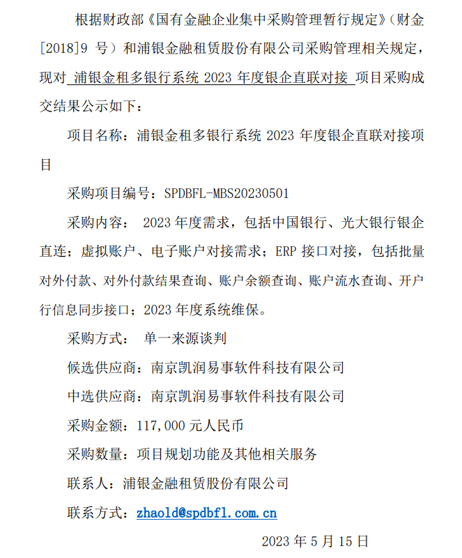 浦银金融租赁股份有限公司 多银行系统 2023 年度银企直联对接项目 采购成交结果公告