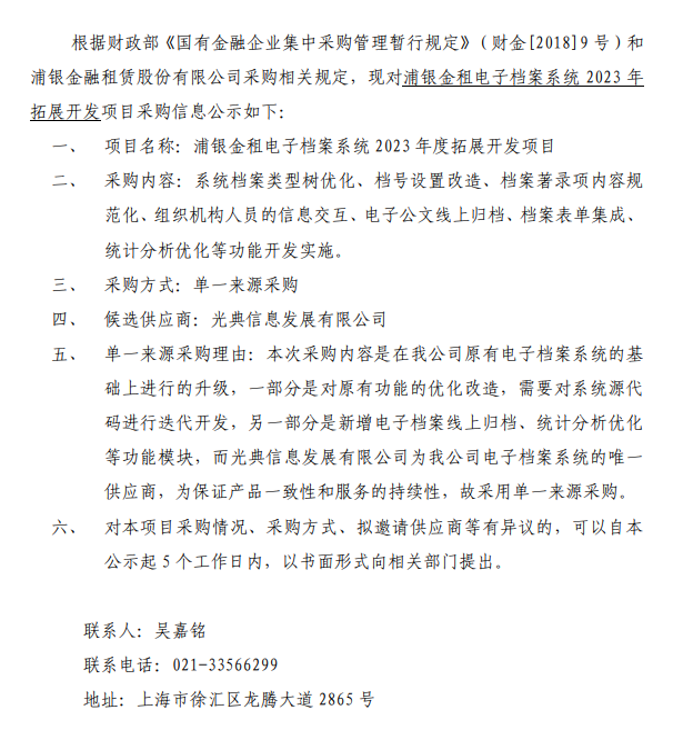 浦银金租电子档案系统 2023 年度拓展开发项目 单一来源采购信息公告