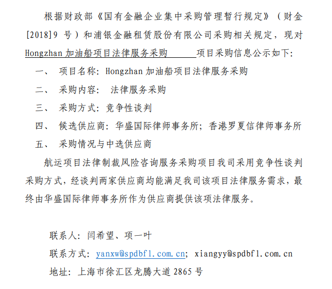 浦银金融租赁股份有限公司 Hongzhan 加油船项目 法律服务采购信息公告
