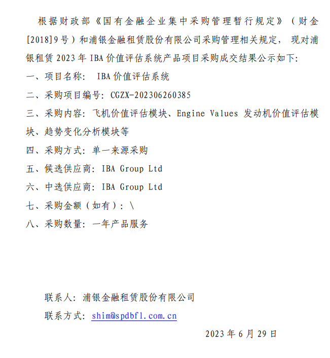 浦银金融租赁股份有限公司 IBA 价值评估系统产品 采购成交结果公告
