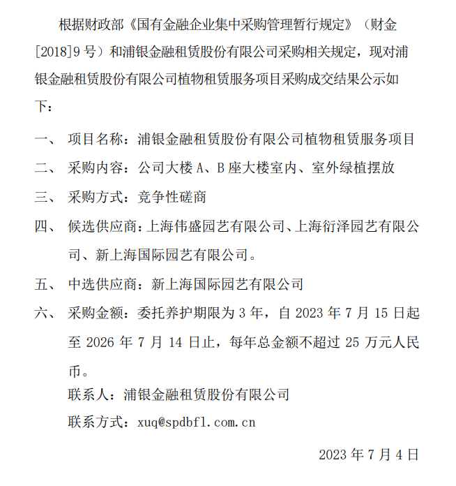 浦银金融租赁股份有限公司 植物租赁服务项目采购成交结果公告