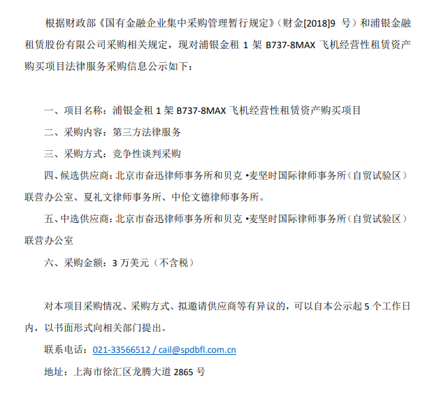 浦银金租 1 架 B737-8MAX 飞机经营性租赁资产购买项目 采购信息公告