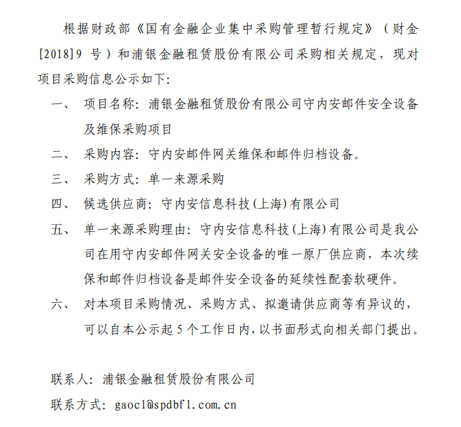 浦银金融租赁股份有限公司 守内安邮件安全设备及维保采购项目 单一来源采购信息公告