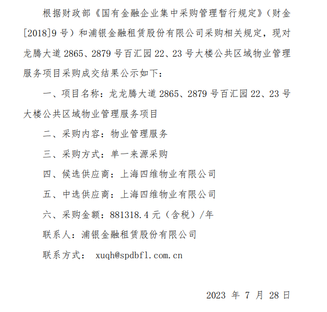 浦银金租公共区域物业管理服务项目采购成交结果 公告
