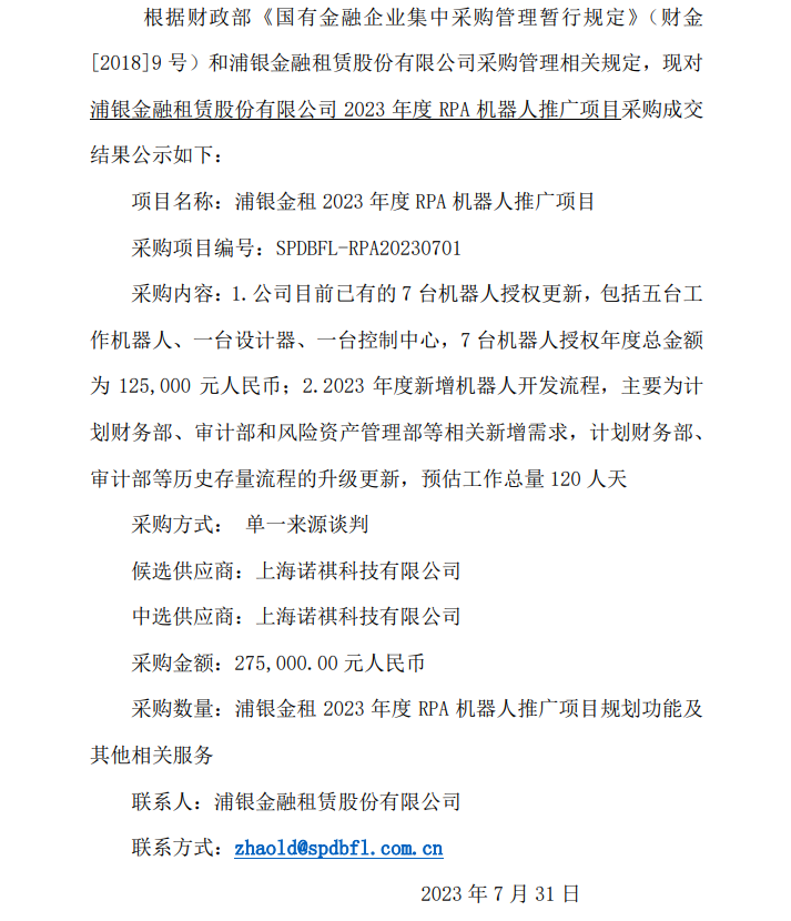浦银金融租赁股份有限公司 2023 年度 RPA 机器人推广项目采购成交结果公告