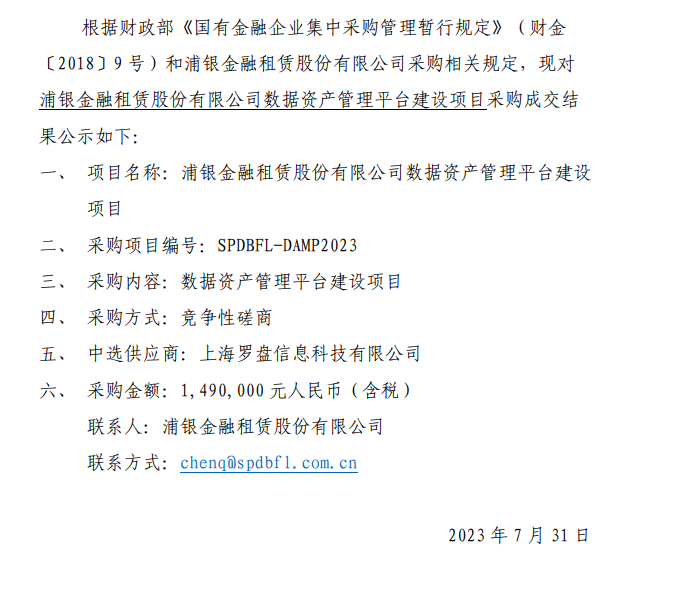浦银金融租赁股份有限公司 数据资产管理平台建设项目采购成交结果公告